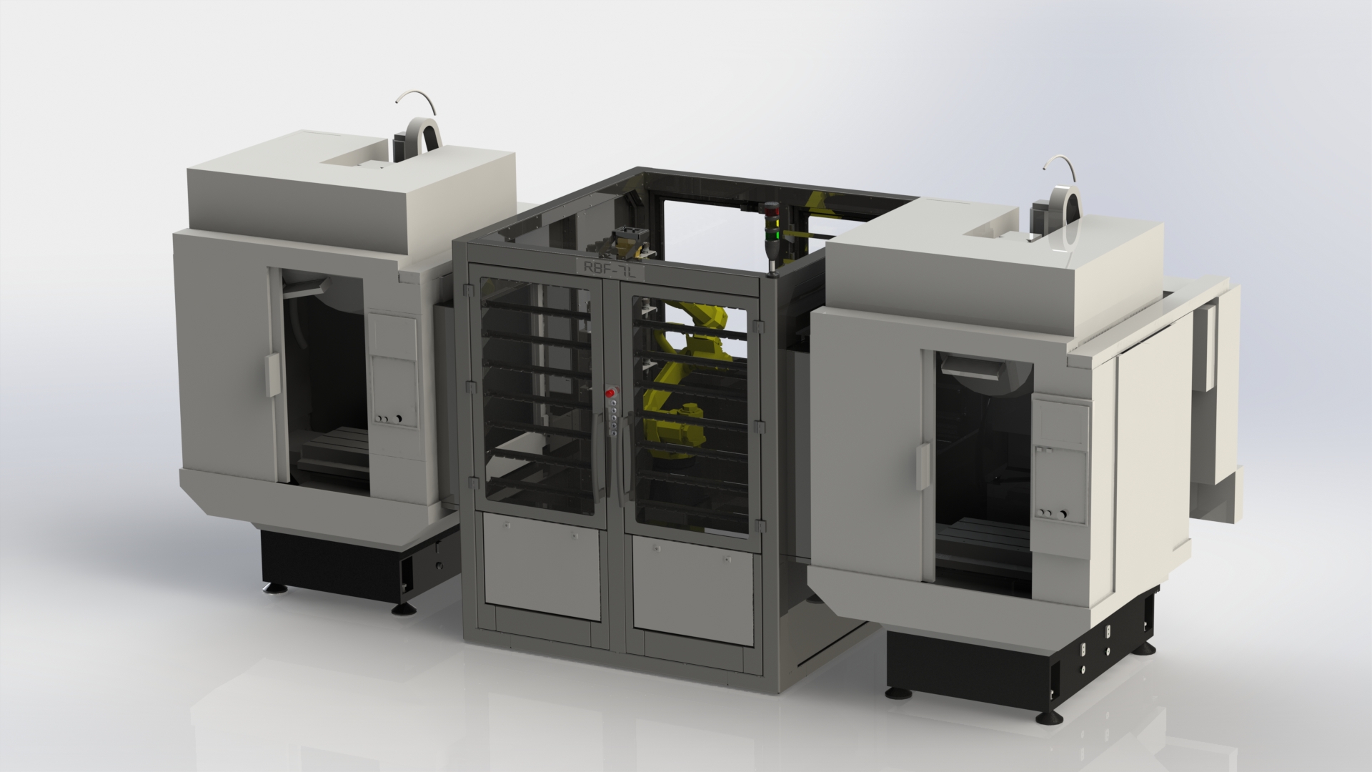 AUST designed this new automation concept for a series of machining centers. In this new design, robots pick up and deliver parts from cell to cell. Each movement to the machining center includes removal of a finished part and delivery of a raw part.