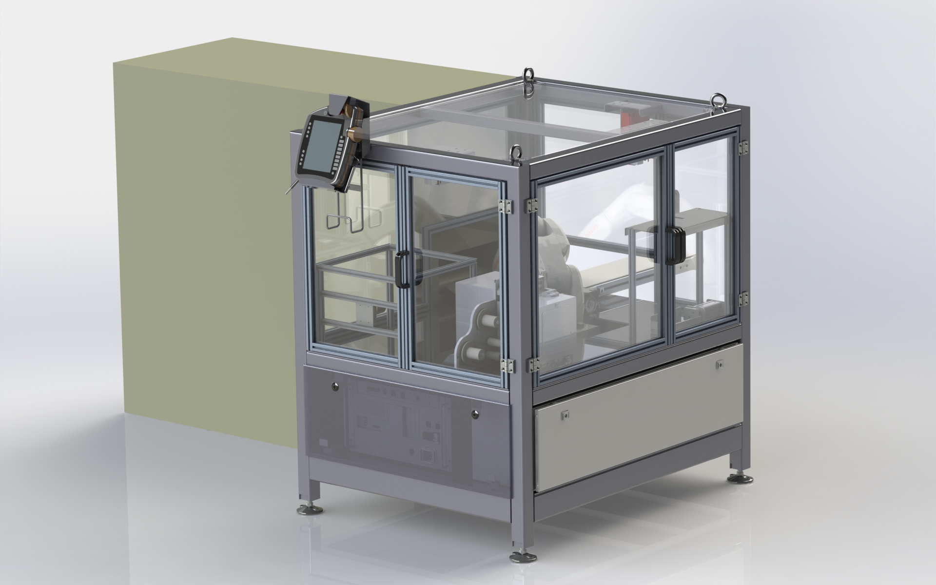 AUST has designed this new concept of automation for an inspection and labeling solution. In this new design, the robot collects and delivers parts at all stages - visual inspection, labeling and packaging.
